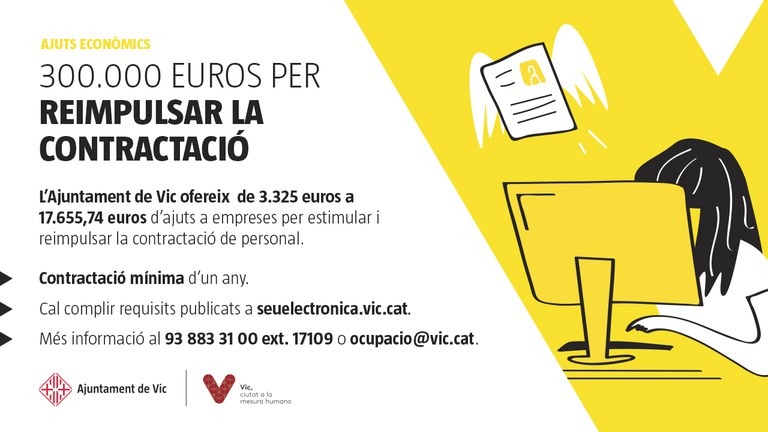 - Ajuts de 3.325 euros a 6.650 euros per a empreses d’Osona que contractin persones de Vic en situació d’atur, a mitja jornada o completa, durant un any. Es poden presentar fins a l’1 d’agost.