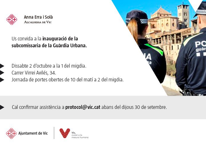 L’acte estarà presidit per l’alcaldessa de Vic, Anna Erra; i també comptarà amb les intervencions de la regidora de Convivència i Seguretat, Elisabet Franquesa, i de l’inspector en cap de la Guàrdia Urbana, Antonio Jurjo.