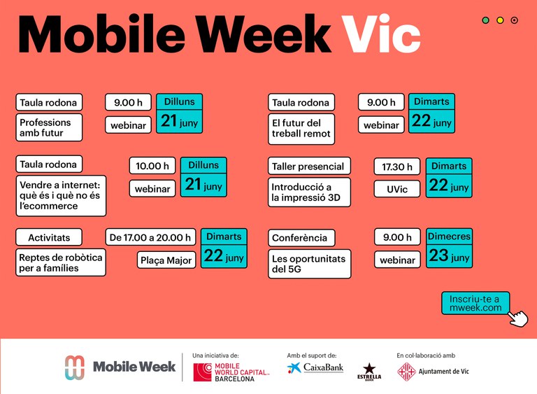 Vic és una de les seus oficials de la Mobile Week 2021. Del 21 al 23 de juny l’Ajuntament de Vic, amb la col·laboració de la Universitat de Vic-Universitat Central de Catalunya (UVic-UCC) i l’Associació d’empresaris de la tecnologia de la informació i la comunicació de la comarca d’Osona (Tic Osona), ha organitzat conferències, tallers, taules rodones i debats amb l’objectiu de posar a l’abast de la ciutadania un espai de participació i reflexió sobre la revolució digital i l’abast de la tecnologia en el nostre dia a dia professional i personal.