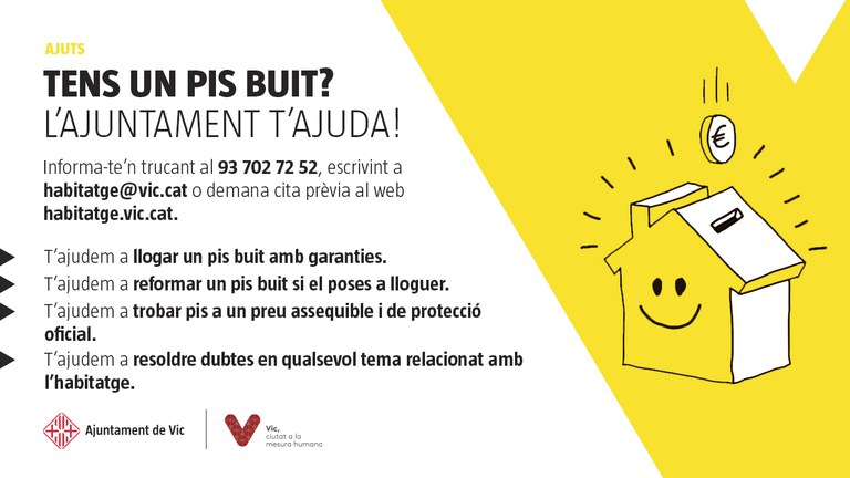 Fins al 31 de març totes les persones, físiques o jurídiques, que tinguin un pis buit en desús poden sol·licitar una subvenció de fins a 15.000 euros per rehabilitar-lo amb el compromís que s’inclogui a la borsa de lloguer assequible durant 5 anys. Un 25% de la subvenció és a fons perdut i la resta es cobrarà mitjançant la renda de lloguer. Així, gràcies al programa InVic, si es rep una subvenció de 15.000 euros per fer habitable un pis, l’Ajuntament de Vic en paga 3.750 a fons perdut si el pis es destina durant 5 anys a lloguer assequible.