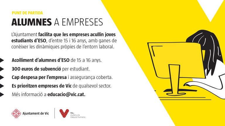 L’Ajuntament de Vic obre una nova convocatòria del projecte “Punt de Partida”, el qual ofereix a l’alumnat de 4t d’ESO participar en estades a les empreses unes hores a la setmana. L’objectiu del projecte és que joves de 15 i 16 anys puguin conèixer el món laboral i desenvolupar habilitats, coneixements i destreses per millorar les seves competències. Enguany, i com a novetat, per facilitar la tasca de les empreses amb la tutoria d’aquests joves durant l’estada, s’oferirà un suport econòmic de 300 euros per alumne a cadascuna de les empreses que participin al projecte, tal com recorda Bet Piella, regidora de Promoció Econòmica, Comerç i Ocupació. En total l’Ajuntament destinarà al projecte una partida de 15.000 euros i cal destacar que no suposa cap despesa per l’empresa i que l’assegurança està coberta.