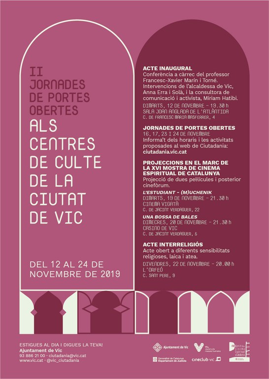 Des de l’inici de l’any 2019 l’àrea de Ciutadania de l’Ajuntament de Vic ha comptabilitzat una vintena d’assessoraments a entitats religioses de la ciutat. Enguany, també, ha estat la primera vegada que les entitats religioses han tingut la possibilitat de participar a la Mostra d’Entitats i Músiques de Vic. Totes aquestes actuacions tenen com a objectiu promoure un espai de trobada i de diàleg entre les comunitats religioses i acostar a la ciutadania la diversitat religiosa de la ciutat i del país.