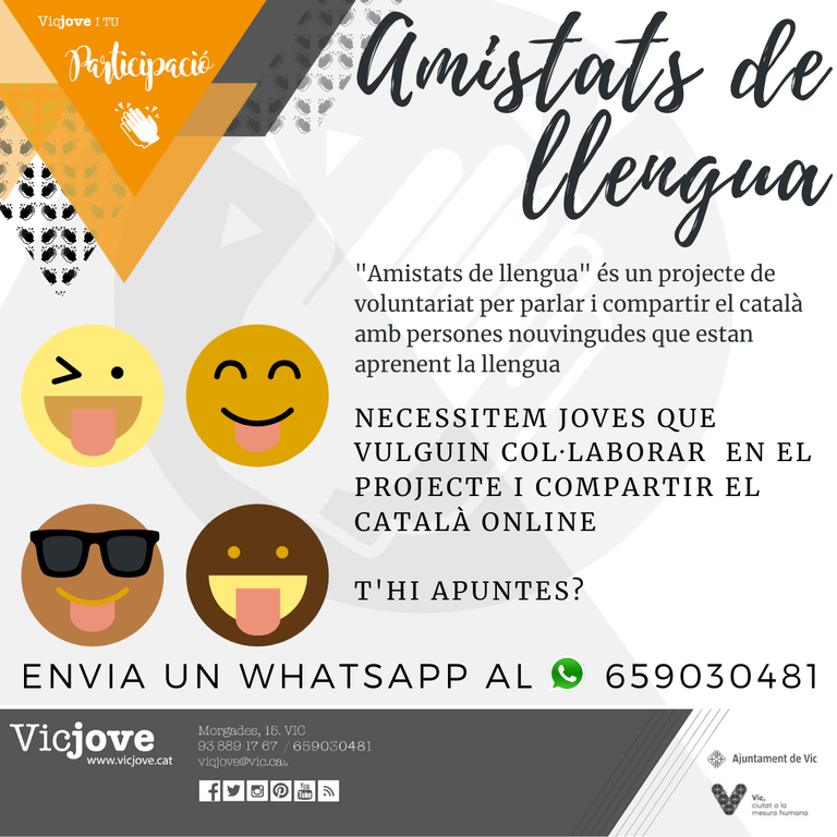 Totes les persones que estiguin interessades en col·laborar al projecte han d’enviar un whatsapp al número 659 03 04 81. Elisabet Franquesa, regidora d’Educació i Joves, Convivència i Seguretat, destaca el valor de les trobades espontànies entre joves “per aconseguir una major integració a la ciutat i un aprenentatge més informal de la llengua”.
