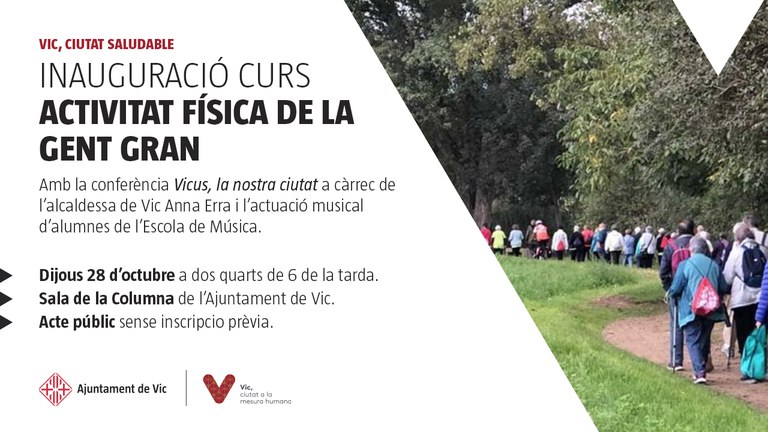 Dijous vinent, dia 28 d’octubre, a dos quarts de 6 de la tarda a la Sala de la Columna de l’Ajuntament de Vic es recupera la inauguració del curs d’activitat física de la gent gran, després d’un any sense fer-se a causa de la pandèmia.