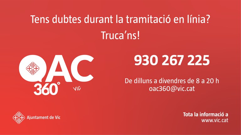 Per contactar amb aquest servei d'ajuda es podrà fer trucant al 930 267 225 o escrivint a oac360@vic.cat, de dilluns a divendres de 8 del matí a 8 del vespre. El servei, totalment gratuït, permetrà fer consultes i resoldrà dubtes sobre diversos tràmits com el procediment per presentar una instància electrònica, l'ús de plataformes de contractació, notificacions electròniques o inscripcions telemàtiques, entre d'altres.