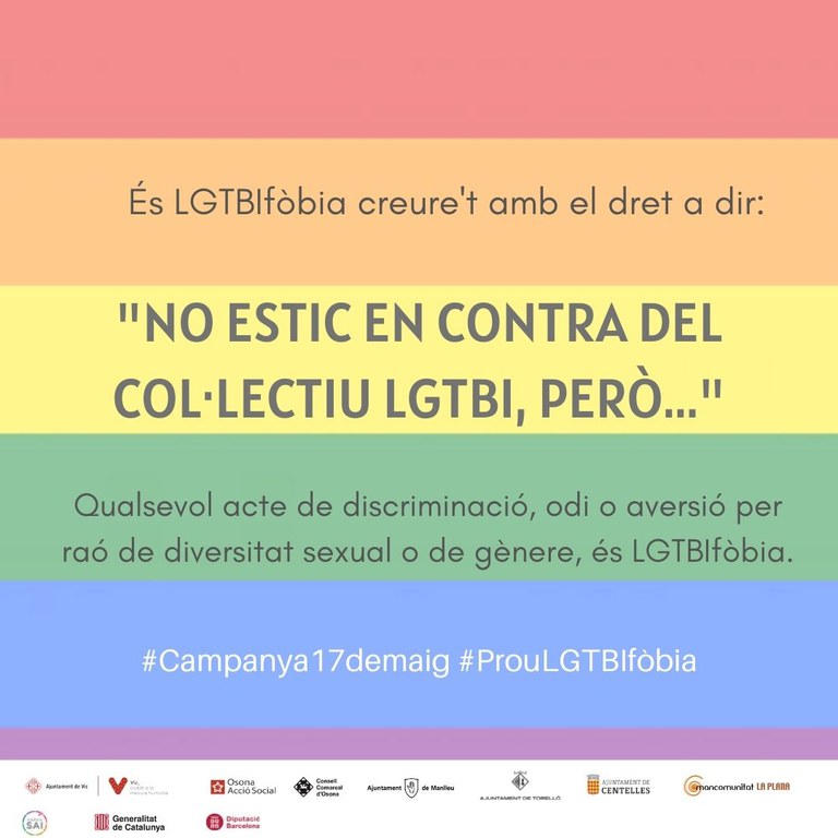 Per aquest motiu tothom que vulgui sumar-se a la campanya pot compartir els missatges amb els hastags: #17maig #prouLGTBIfòbia #osonaambtotselscolors i #SAIOsona.